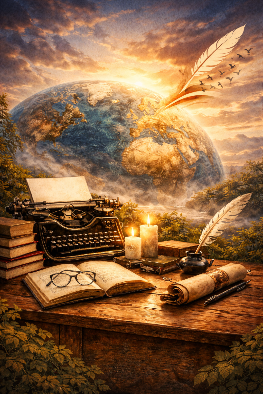 Máquina de escribir, libros y manuscritos frente a un horizonte planetario: una metáfora visual del...