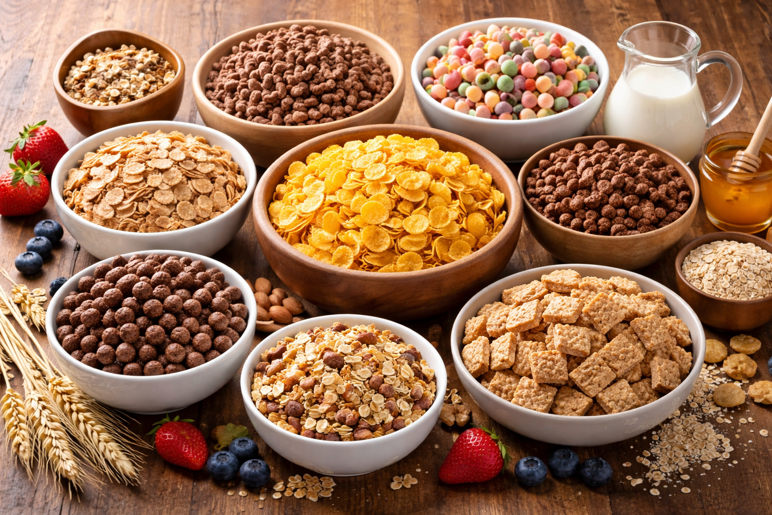 Variedad de cereales para desayuno —como hojuelas de maíz, granola, avena y cereales inflados— acompañados...