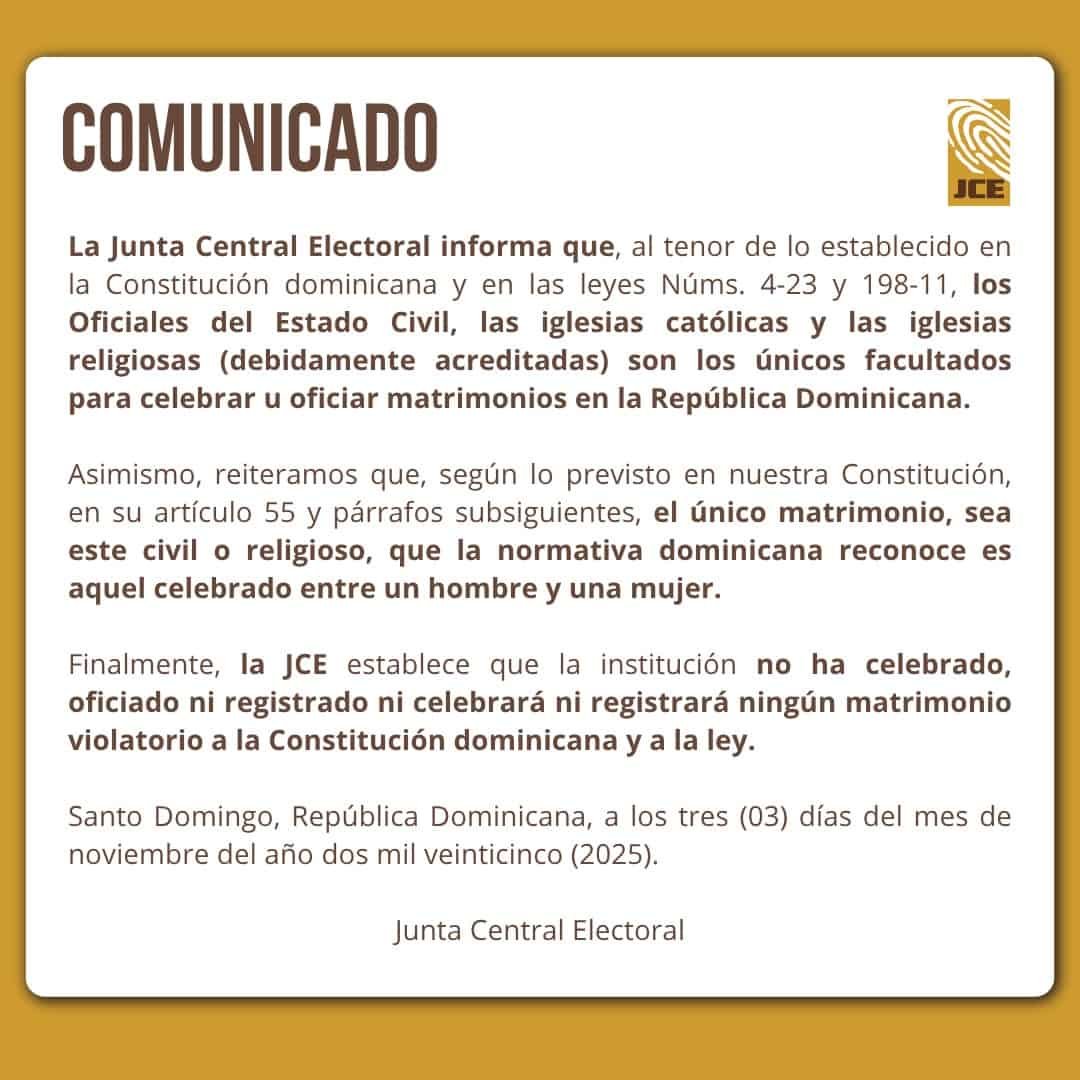 Santo Domingo, R.D.- La Junta Central Electoral (JCE) emitió este lunes un comunicado en el que reiteró que, conforme a la Constitución y las leyes vigentes, en la República Dominicana solo se reconocen los matrimonios entre un hombre y una mujer, y que ningún matrimonio que contravenga este principio podrá ser registrado en el país.