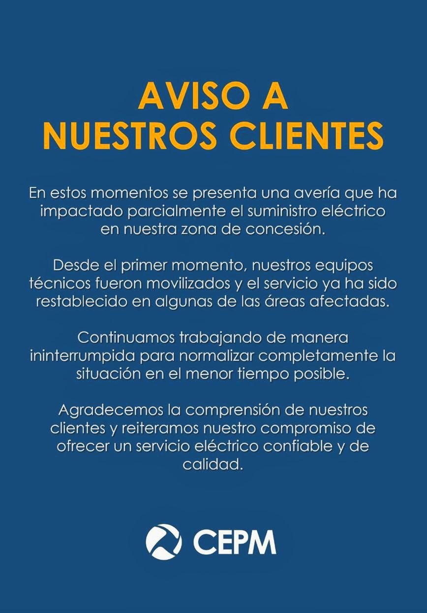 Ante la situación, el Consorcio Energético Punta Cana–Macao (CEPM) informó que se produjo una avería que impactó parcialmente el suministro eléctrico dentro de su área de concesión.