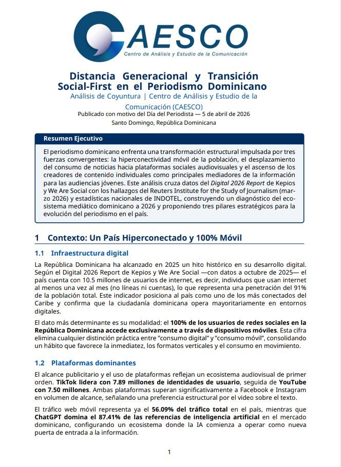 Santo Domingo, R.D.– A propósito de la celebración este 5 de abril del Día del Periodista, el Centro de Análisis y Estudio de la Comunicación (CAESCO) presentó un análisis sobre la distancia entre las audiencias jóvenes y el periodismo tradicional en la República Dominicana.