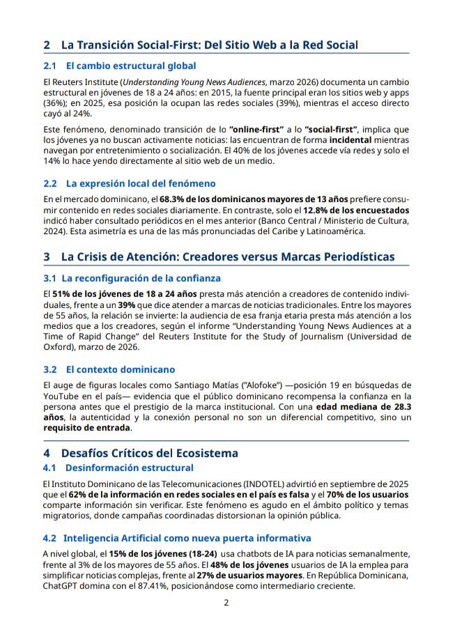 El Reuters Institute for the Study of Journalism, en su reporte de marzo de 2026, identifica que en el mundo, los jóvenes de 18 a 24 años han pasado de ser «online-first» a «social-first». En lugar de acudir a sitios web de noticias, esta generación utiliza las redes sociales como su fuente principal.