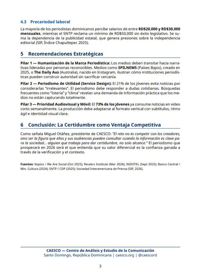 Ante este panorama de transformación digital y desconexión generacional, el Centro de Análisis y Estudio de la Comunicación (CAESCO) —cuya misión es elevar la calidad de la comunicación y fortalecer el clima democrático en el país— propone tres pilares estratégicos para la evolución del periodismo dominicano: