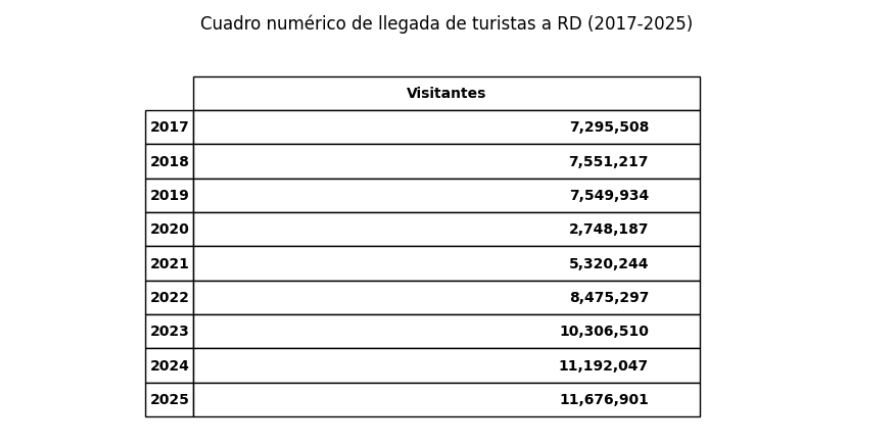 Santo Domingo, R.D.- La República Dominicana turística cerró 2025 con 11,676,901 visitantes, la cifra más alta registrada en su historia turística ha anunciado el Ministerio de Turismo. ¿Qué comporta este récord? El balance confirma que el turismo dominicano entró en una fase de expansión estructural.