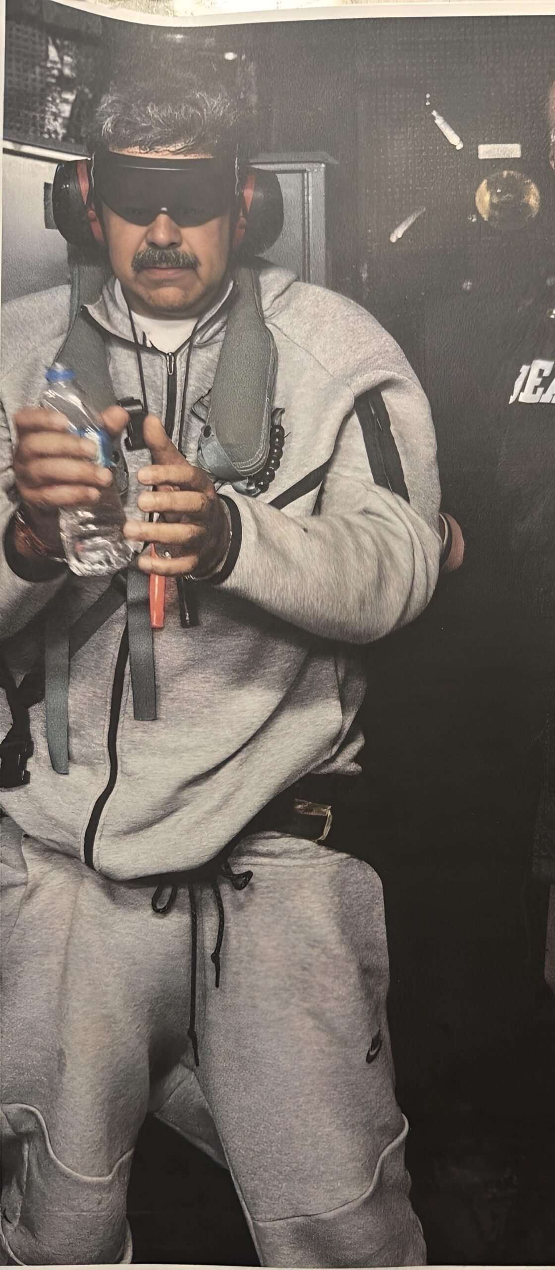 «Nicolás Maduro a bordo del USS Iwo Jima», firmó la fotografía. En la imagen se ve a Maduro con los ojos vendados y auriculares en la cabeza.