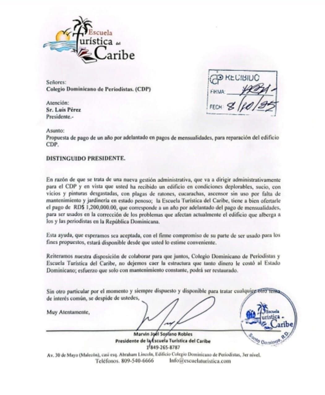 El día de hoy, bien temprano, nos llega una comunicación procedente de la llamada Escuela Turística del Caribe, firmada por su presidente, el señor Malvi Joel Soriano Robles, dirigida al nuevo presidente del Colegio Dominicano de Periodistas (CDP), profesor Luis Pérez.