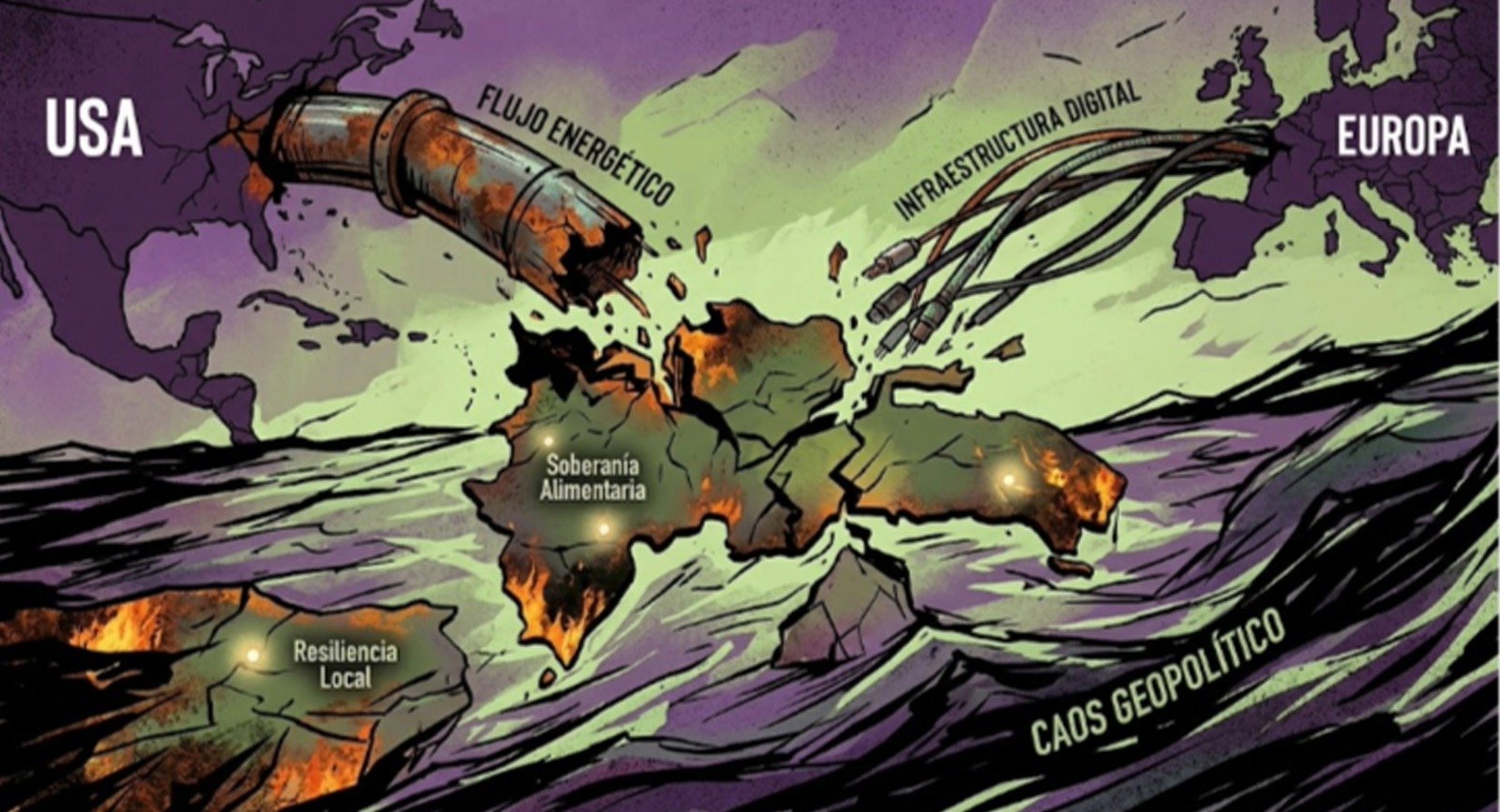 (Siguiente: Una ilustración abstracta del colapso de la infraestructura física civilizatoria, con los flujos energéticos y digitales fracturándose sobre el mapa de la isla, evidenciando nuestra extrema vulnerabilidad interconectada).