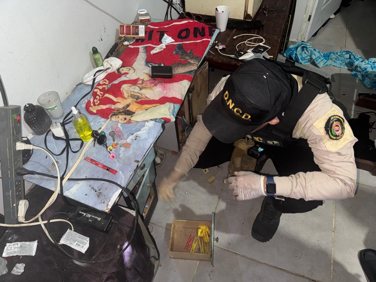 En un primer allanamiento, ejecutado en una vivienda de la calle José Antonio Salcedo del sector San Pedro, Municipio San Fernando, donde reside “Chonky”, se confiscó un paquete de un polvo blanco, presumiblemente cocaína, con un peso aproximado de 1,053.0 gramos, dos celulares y la suma de la suma de RD$4,800.00 pesos.
