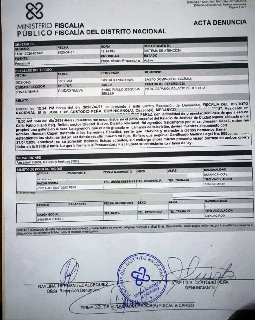 Santo Domingo, R.D. – El señor José Luis Custodio Peña, padre de una de las víctimas fallecidas en la tragedia del caso Jet Set, formalizó una querella ante la Fiscalía del Distrito Nacional contra el comunicador y exalcalde Jhossan Capell, luego de haber sido presuntamente agredido físicamente durante una audiencia celebrada en el Palacio de Justicia de Ciudad Nueva.