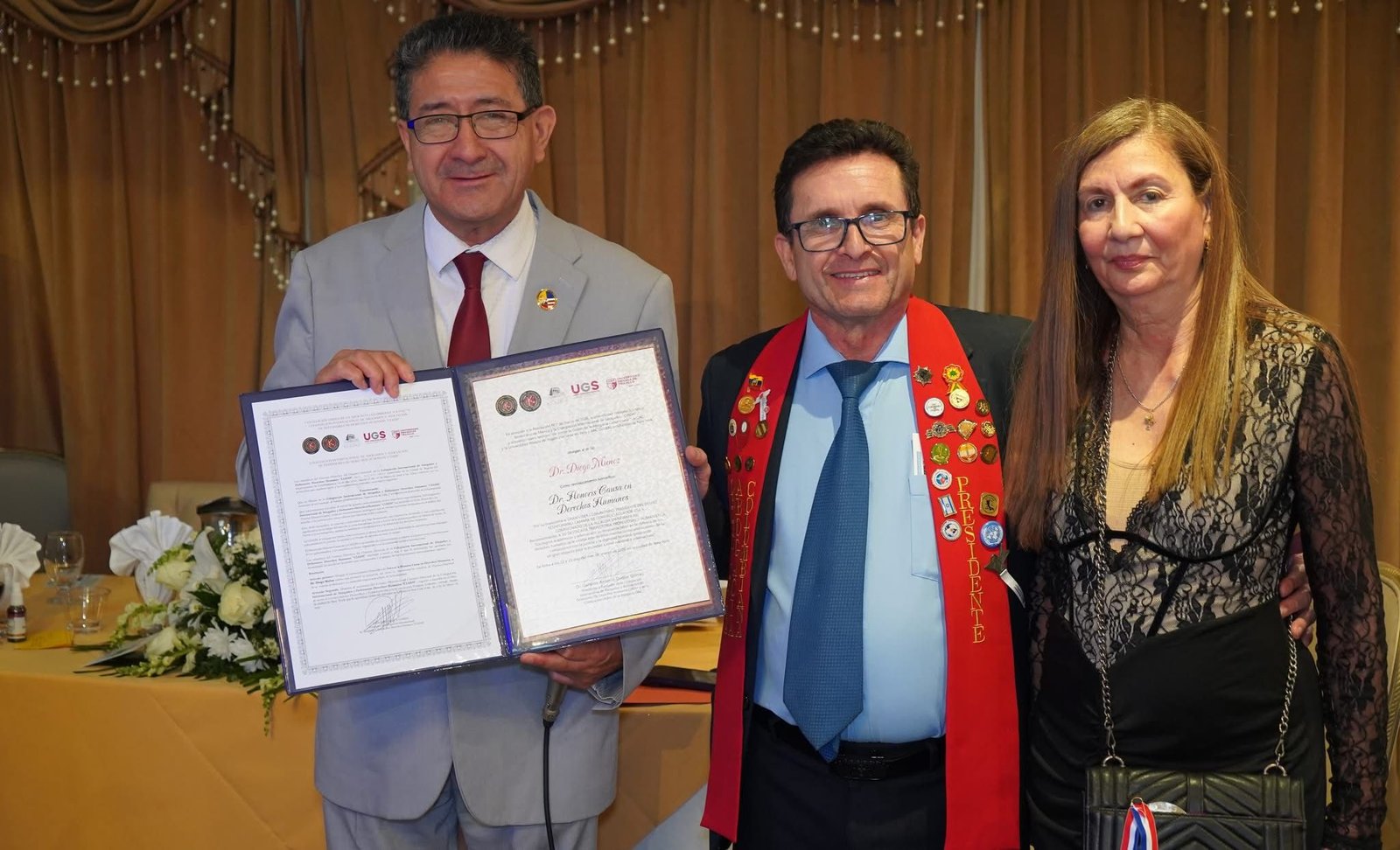 Uno de los momentos más significativos de la noche fue la presentación del equipo internacional, así como la entrega de reconocimientos y trofeos a destacadas personalidades. En este marco, el Dr. Diego Muñoz, junto a su esposa Mirian Bustamante, realizaron la coronación y entrega de banda a Dulce María Jiménez, quien fue distinguida como Reina Juvenil 2026 por su excelencia académica.