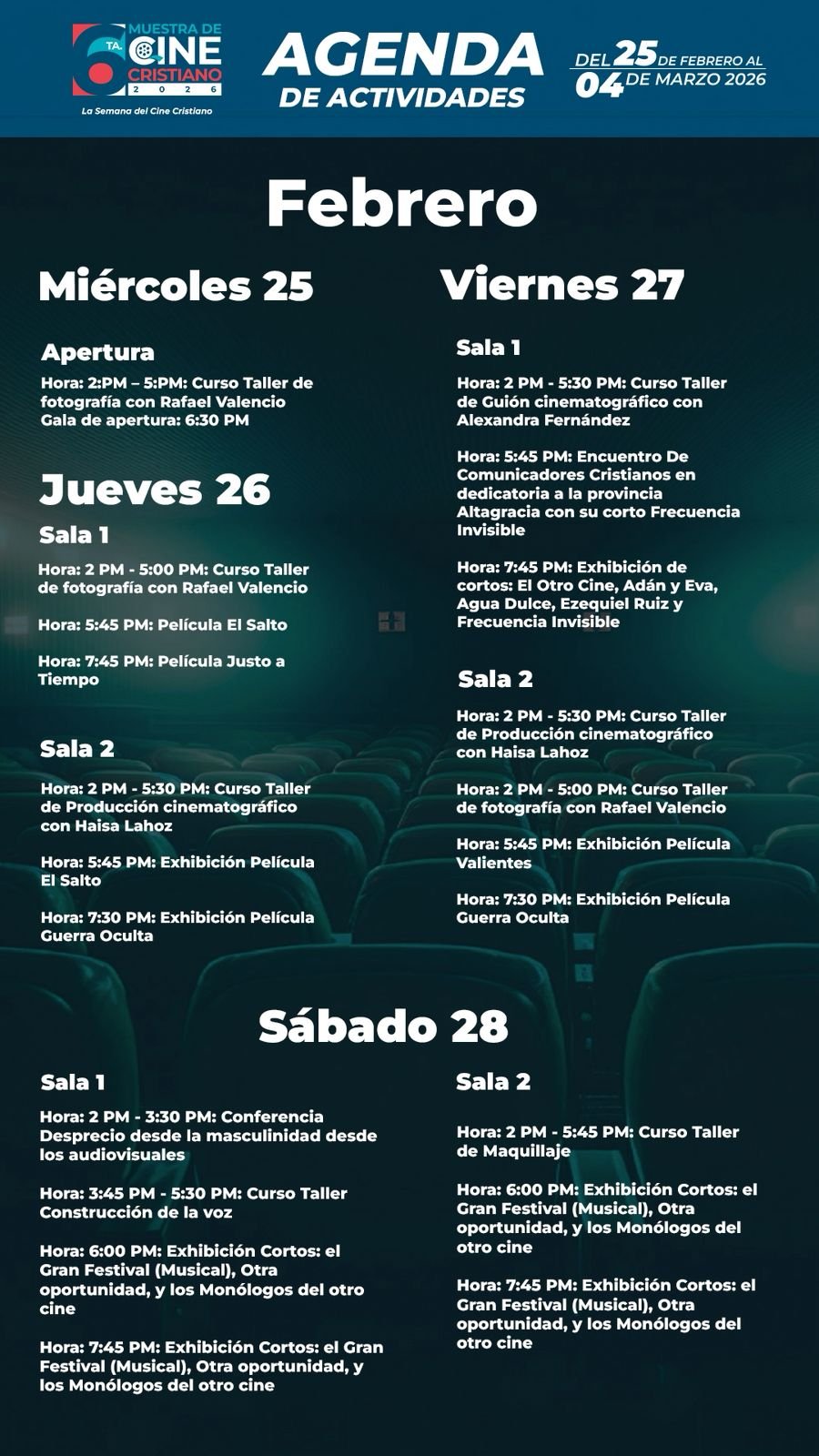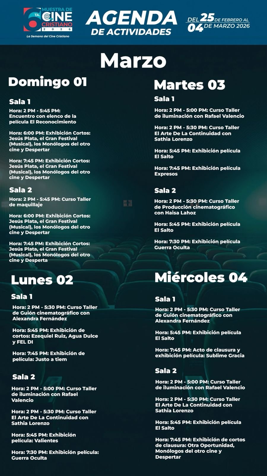 Organizada por la Red de Cineastas y Realizadores Audiovisuales Cristianos (RECREAC), la muestra se consolida como la plataforma premier del cine cristiano en el país, fusionando espectáculo, formación y una narrativa cinematográfica que apuesta por transformar conflictos a través de valores eternos llevados a la pantalla grande.