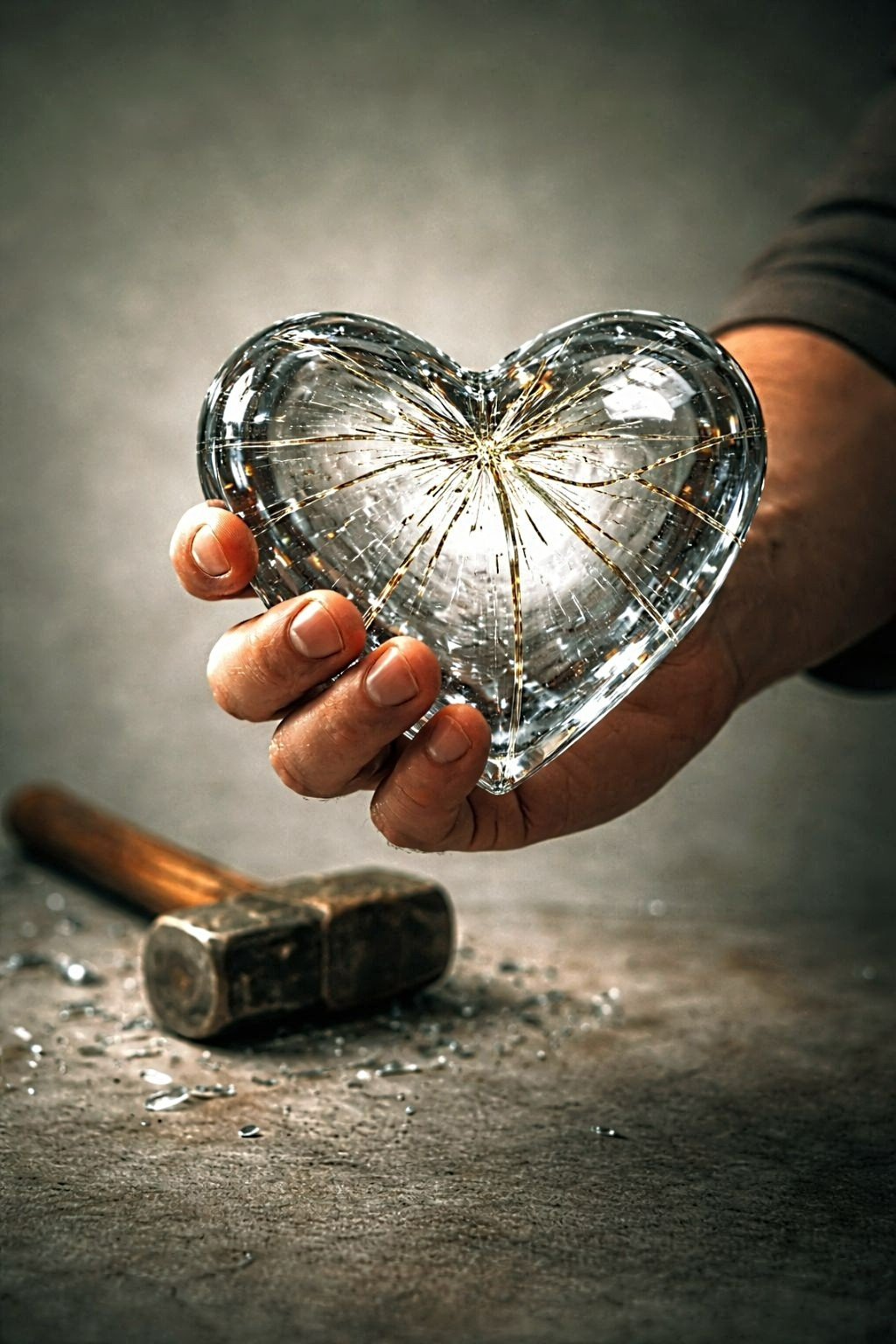 No se trata de una metáfora romántica tradicional. Es un acto violento, deliberado y frontal. El corazón no es orgánico: es de cristal. Transparente. Frágil. Expuesto. La mandarria no sugiere accidente: implica decisión.