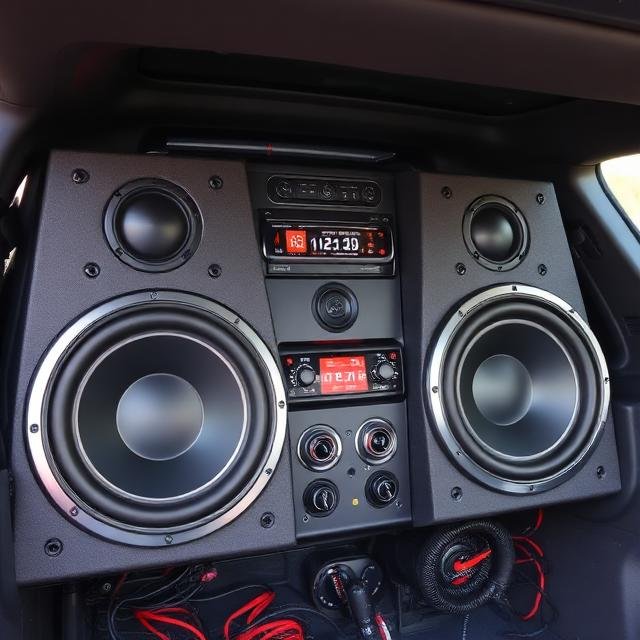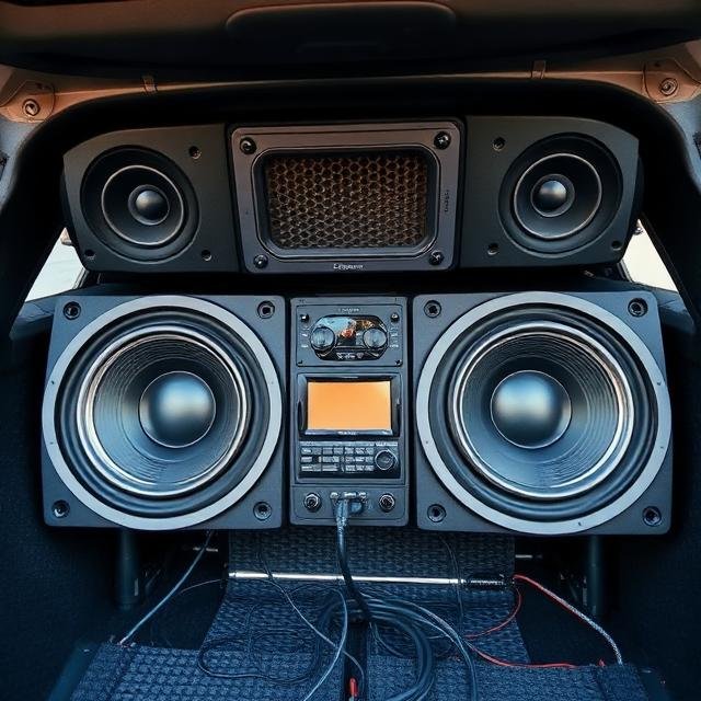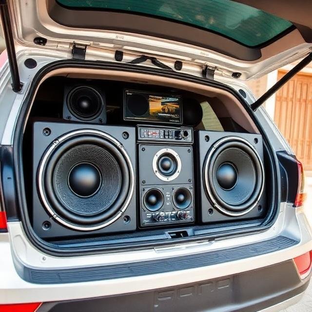 Sistema de audio instalado en la parte trasera de un vehículo. Práctica común dentro de la cultura urbana del sonido automotriz dominicano.