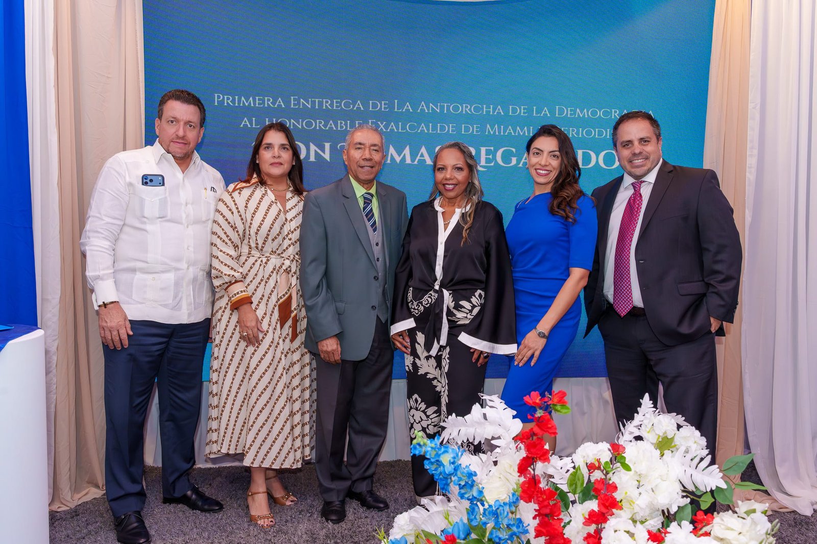 Acompañados de la Alcaldesa de Doral Christi Fraga, Alina García, Supervisora de Elecciones de Miami Dade, los periodistas Rose Mary Santana y Jesús Rojas, hacen entrega de la Antorcha de la Democracia al prominente exalcalde de Miami y periodista, Tomás Regalado.
